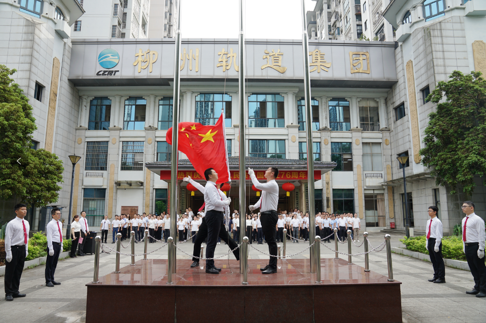 9月30日上午,柳州轨道集团在集团总部举行升国旗仪式,集团领导班子、党员、职工代表100余人参加仪式。