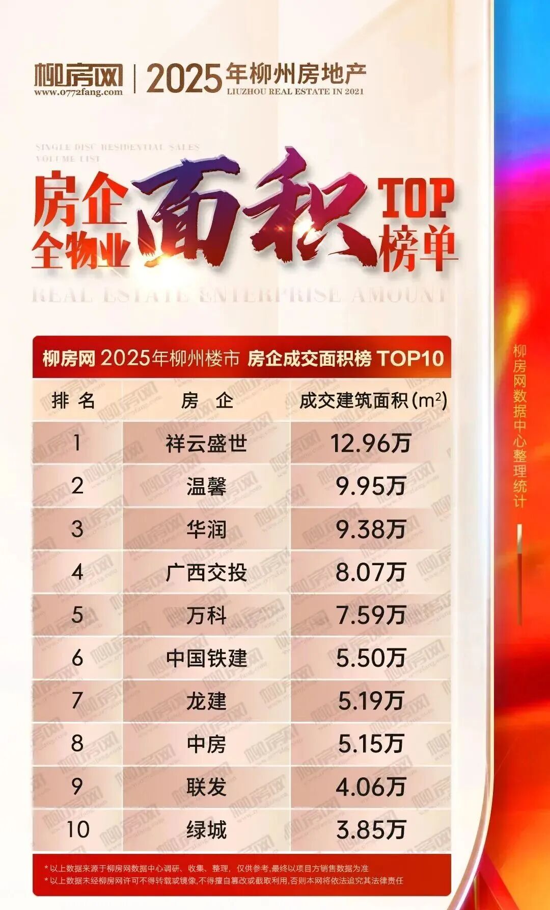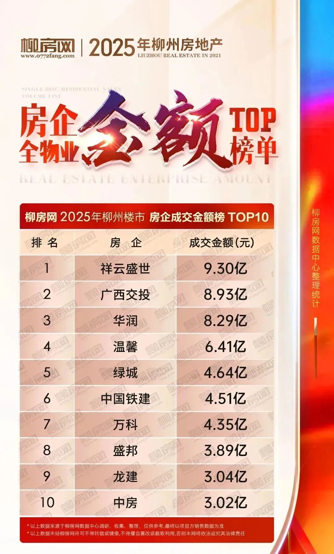 近日,柳房网刊登《2025年柳州楼市量价企稳,销售榜单正式发布!》,柳州轨道集团旗下温馨公司和龙建公司在房地产销售领域双双入选2025年柳州楼市房企成交金额榜和面积榜TOP10,温馨公司更以9.95万平方米的销售成绩荣获面积榜亚军。